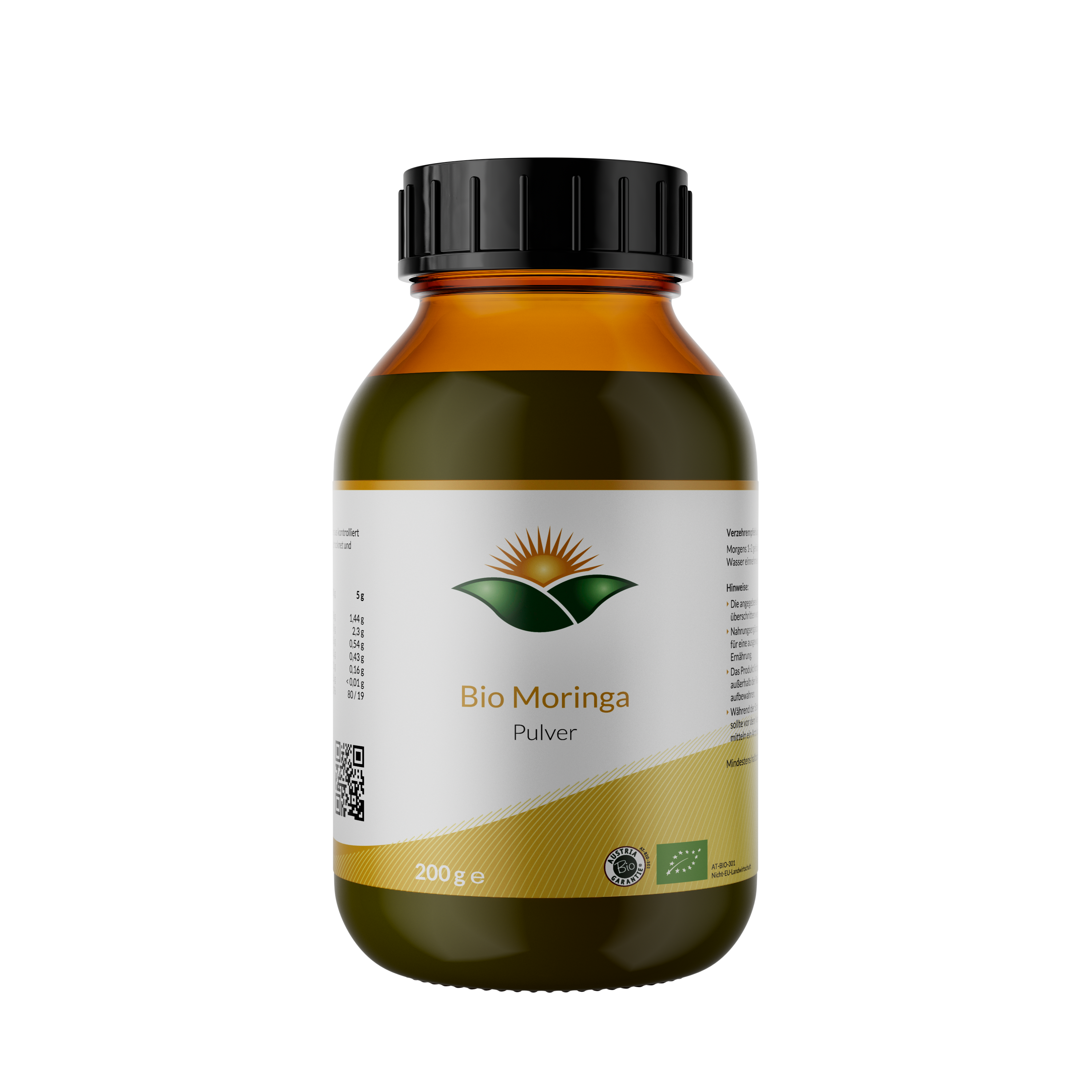 Moringa Pulver wird aus den Blättern des Moringa-Baums gewonnen und zeichnet sich durch ein besonders breites Nährstoffprofil pflanzlichen Ursprungs aus. Die Blätter enthalten von Natur aus eine Vielzahl an Mineralstoffen, Aminosäuren, pflanzlichen Proteinen sowie sekundären Pflanzenstoffen, wie sie typischerweise in grünem Blattgemüse vorkommen.